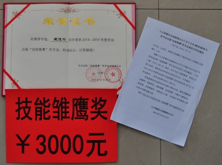 藏運平,數控1171班學(xué)生,榮獲2014-2015年度“技能雛鷹”獎,是“技能雛鷹”獎設立后第一批獲獎學(xué)生。首批“技能雛鷹”共200名,其中內蒙古4名。首批“技能雛鷹”獲獎學(xué)生還參加了首屆中國青年技能夏令營(yíng)。藏運平歷年獲獎情況:2013.3.22獲呼倫貝爾市技能大賽普通車(chē)工第一名,2013.4.23獲內蒙古自治區技能大賽普通車(chē)工第一名,2013.8參加全國首屆青年技能夏令營(yíng),2014.3.22獲呼倫貝爾市技能大賽數控車(chē)工第一名,2014.4.24獲內蒙古自治區技能大賽數控車(chē)工一等獎,2013-2014學(xué)年第一學(xué)期獲一等獎學(xué)金,華育一等助學(xué)金,2013-2014學(xué)年第二學(xué)期獲一等獎學(xué)金,2014.6.25獲全國技能大賽數控車(chē)工優(yōu)秀獎。