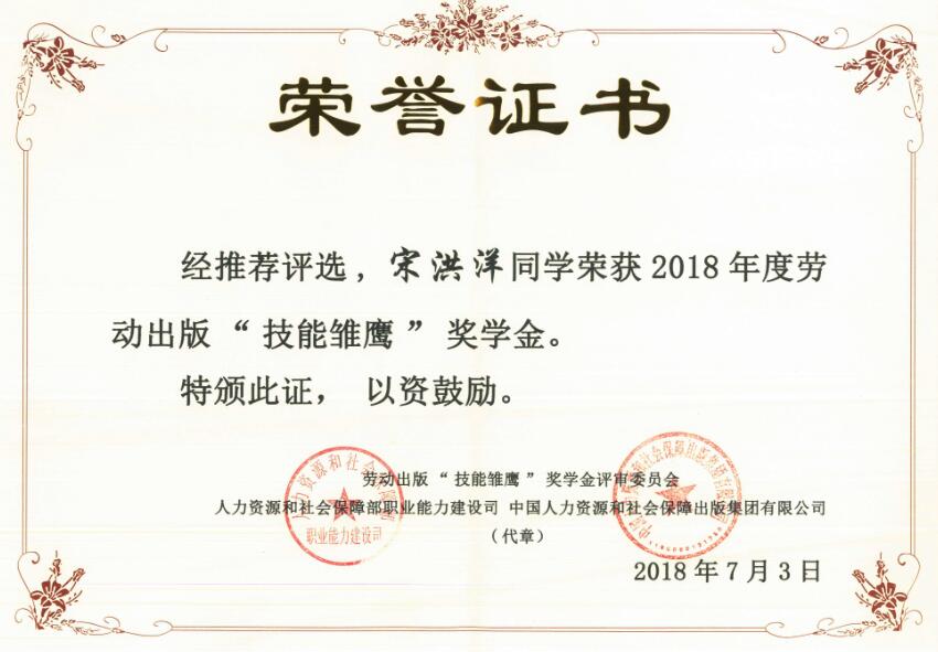 數控專(zhuān)業(yè)學(xué)生宋洪洋榮獲2018年“技能雛鷹”獎