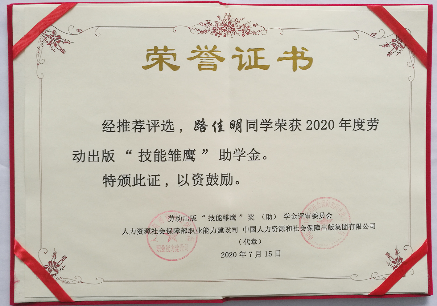 微機專(zhuān)業(yè)學(xué)生路佳明榮獲2020年“技能雛鷹”獎