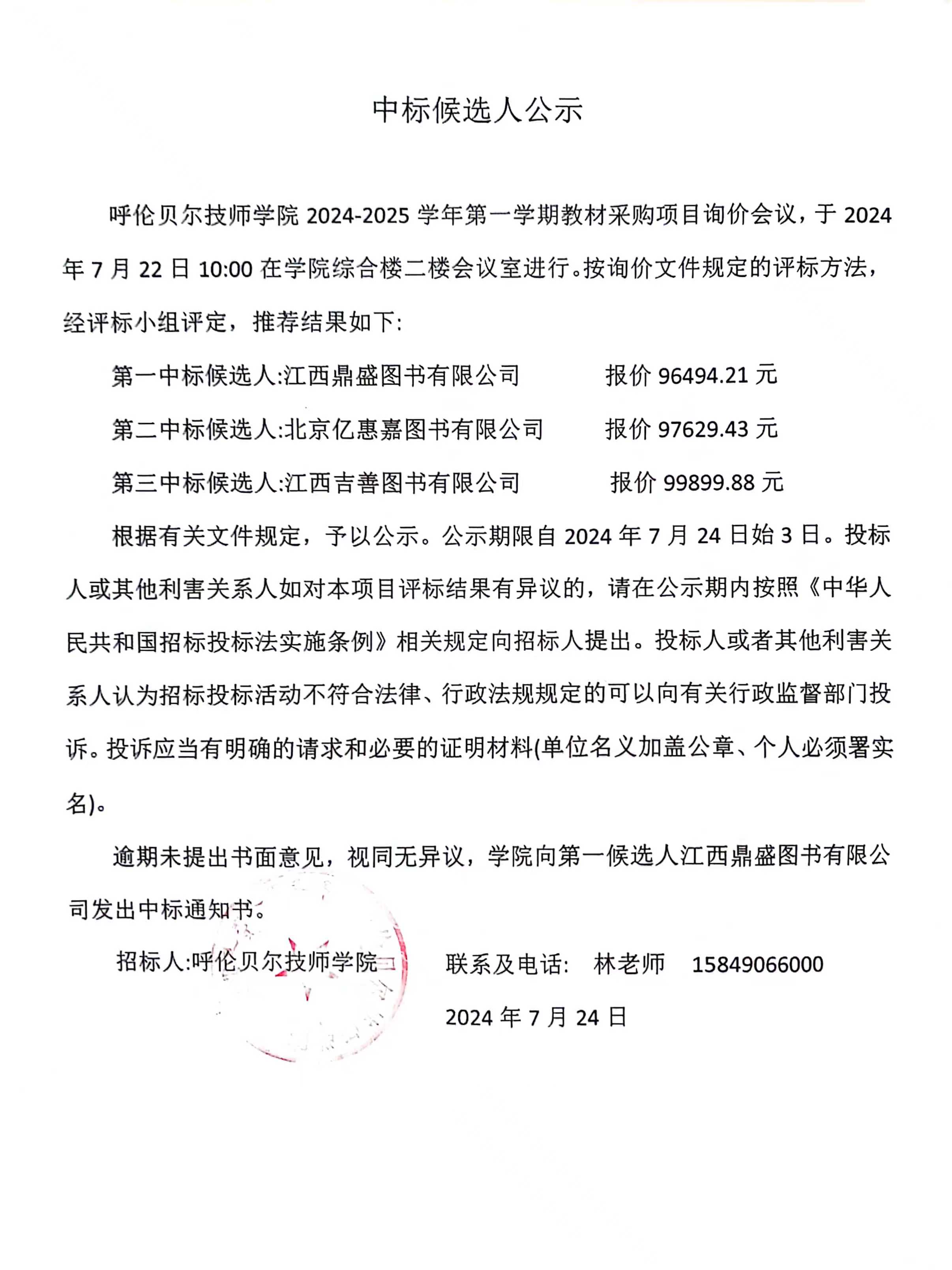 呼倫貝爾技師學(xué)院 2024-2025學(xué)年第一學(xué)期教材采購項目中標候選人公示