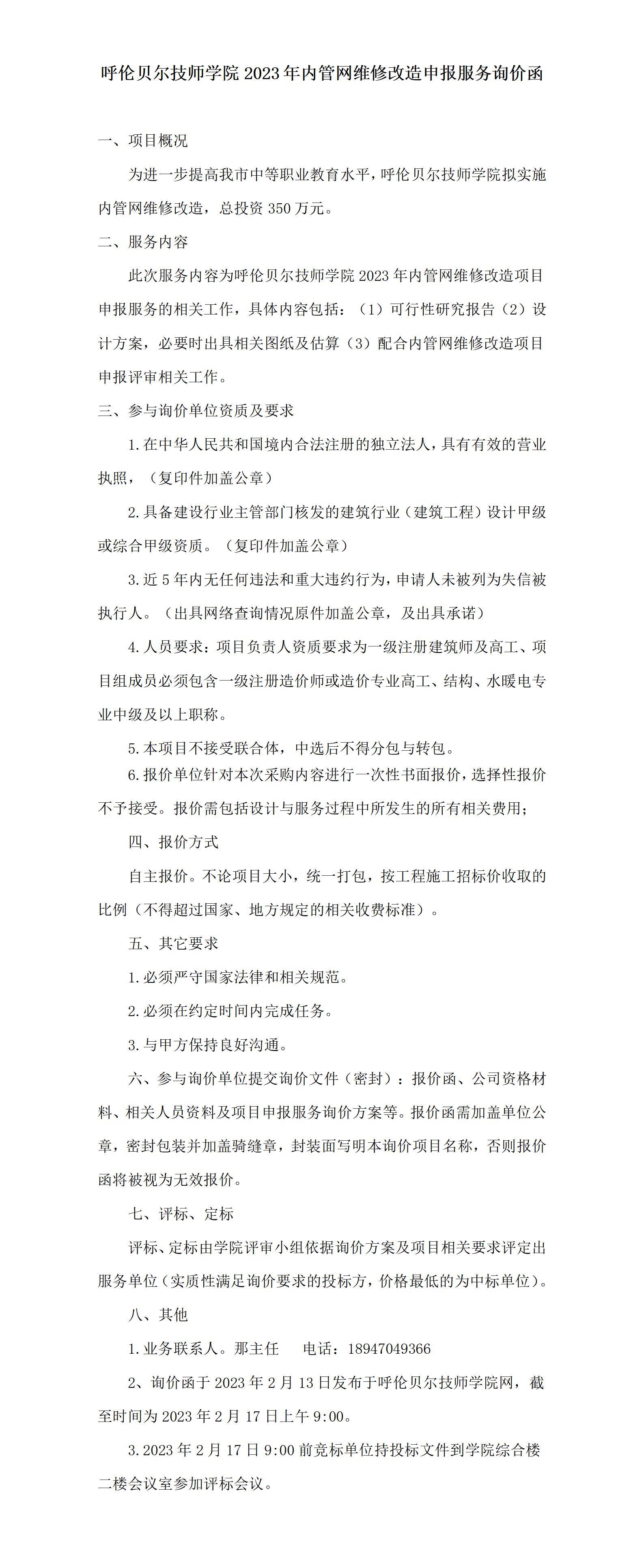 呼倫貝爾技師學(xué)院2023年內管網(wǎng)維修改造申報服務(wù)詢(xún)價(jià)函