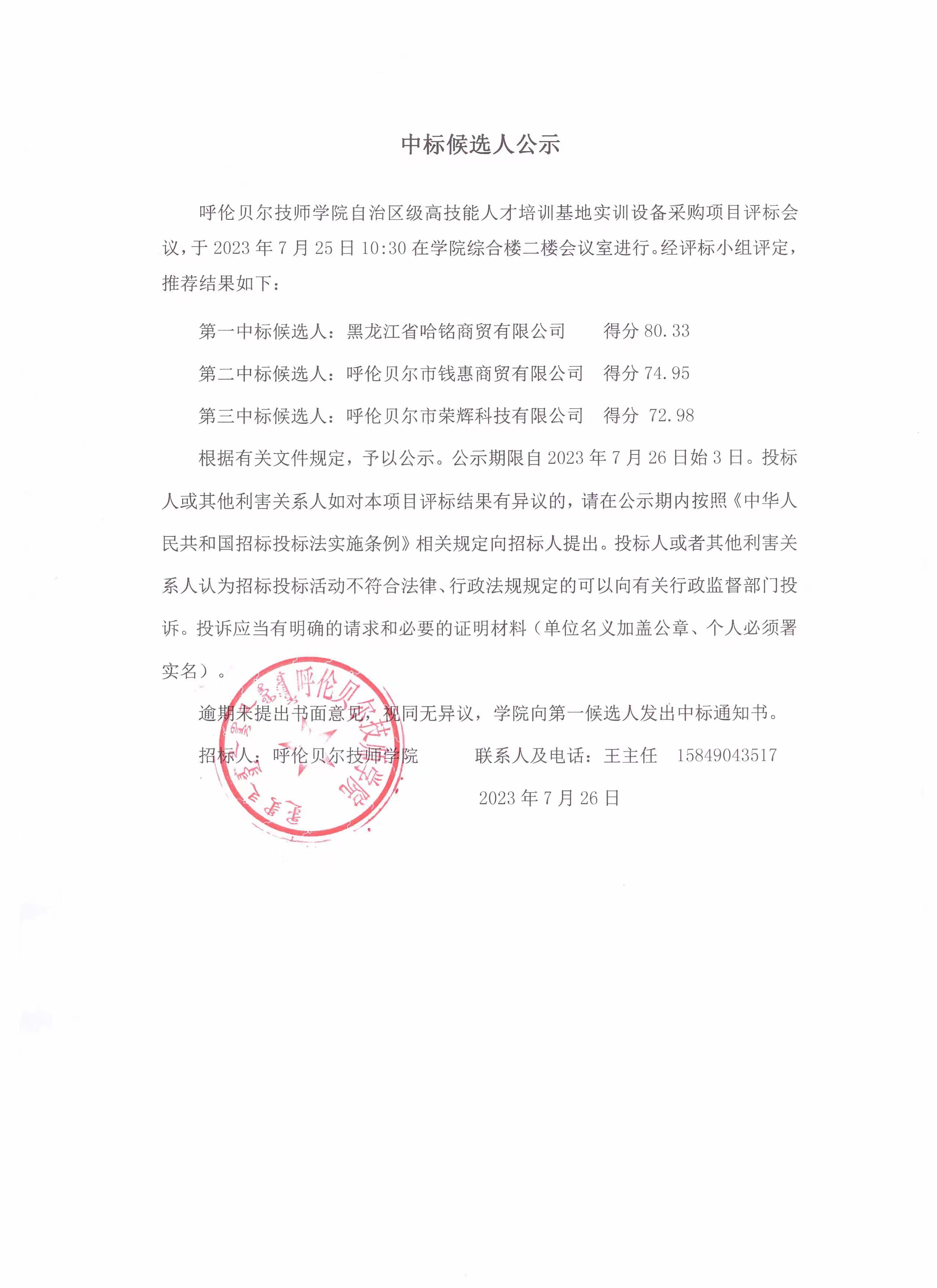 呼倫貝爾技師學(xué)院自治區級高技能人才培訓基地實(shí)訓設備采購中標候選人公示