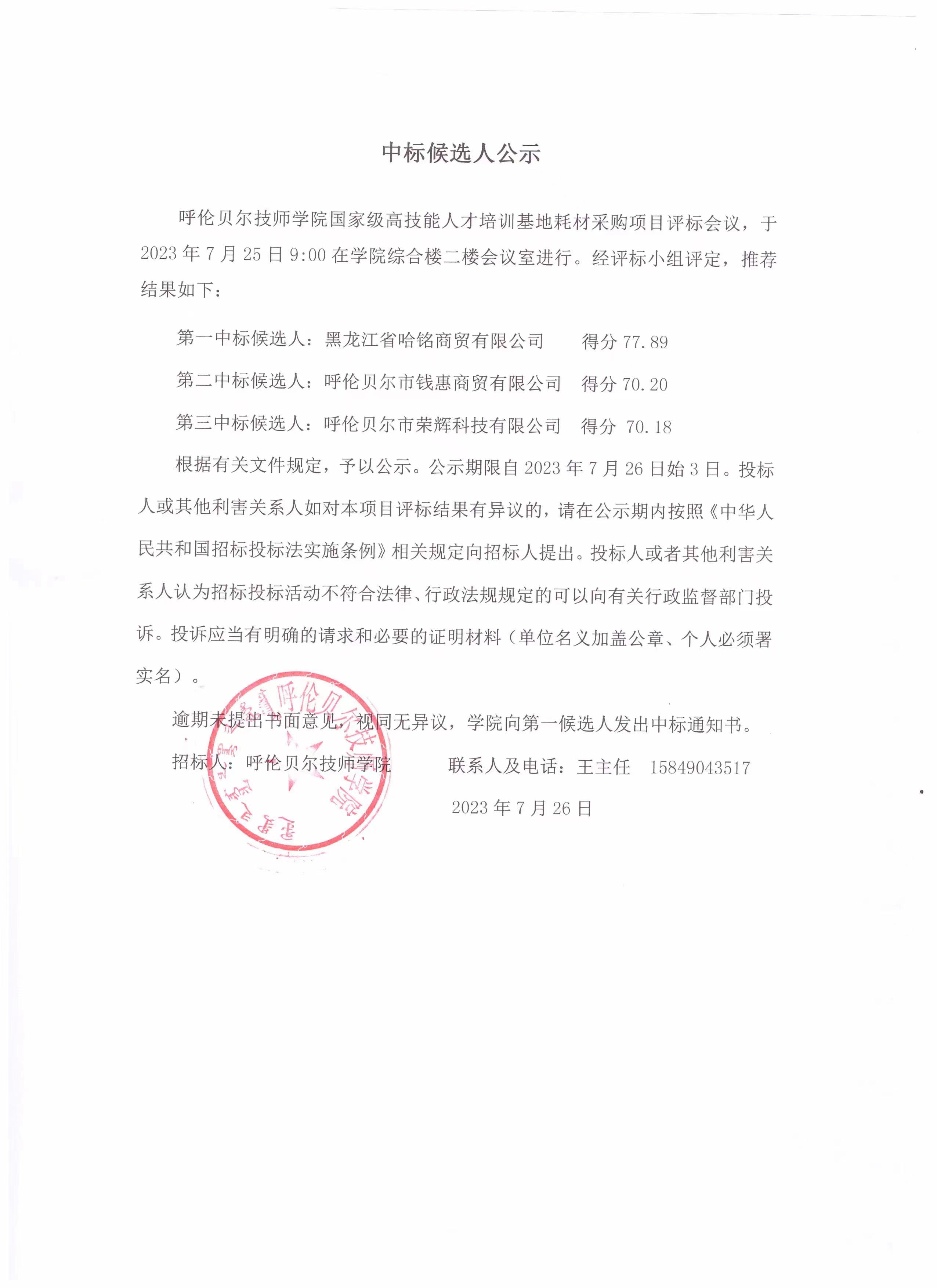 呼倫貝爾技師學(xué)院國家級高技能人才培訓基地耗材采購項目中標候選人公示