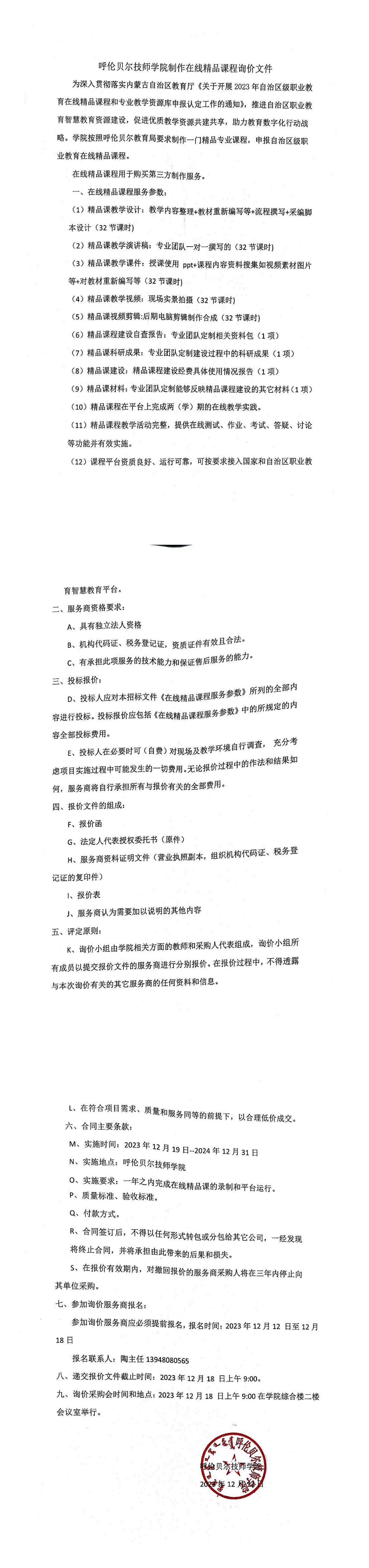 呼倫貝爾技師學(xué)院制作在線(xiàn)精品課程詢(xún)價(jià)文件